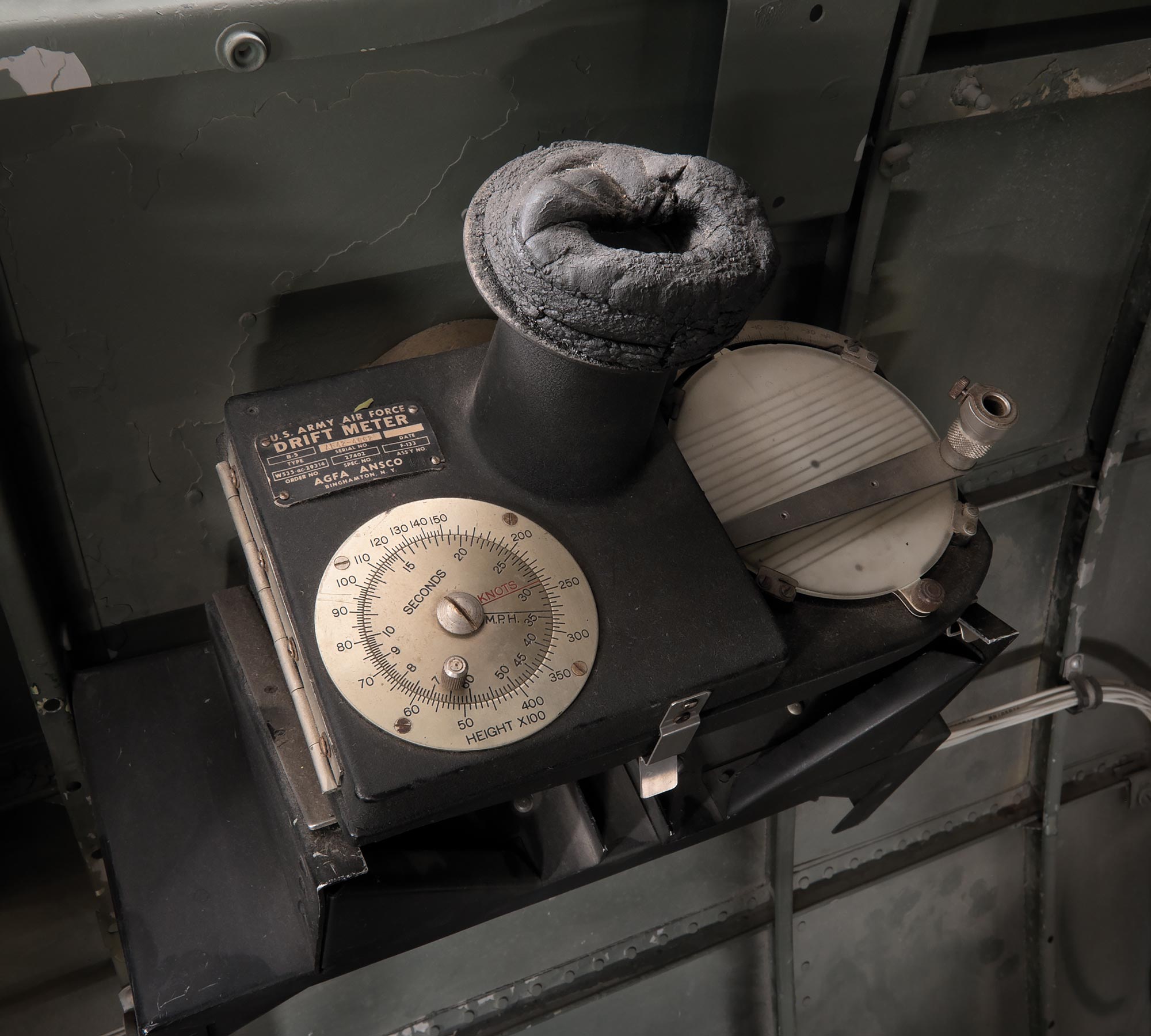 The navigator was positioned in the left-hand side of the nose of the airplane, behind the bombardier. He would track the location of the aircraft through various means such as pilotage, dead reckoning, radio navigation, or celestial navigation. He was also responsible for firing the cheek-mounted .50-caliber machine guns on each side of the nose.