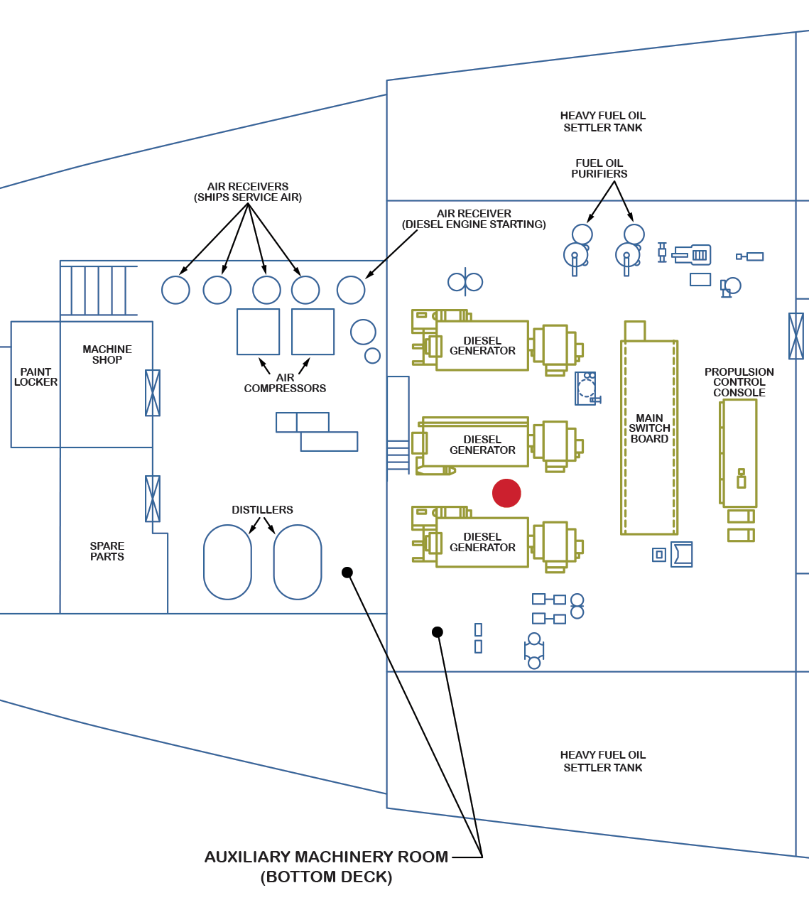 Center section of the auxiliary machinery space. Visible are two of the ship's three generators (Caterpillar diesel engines with AEG generators).