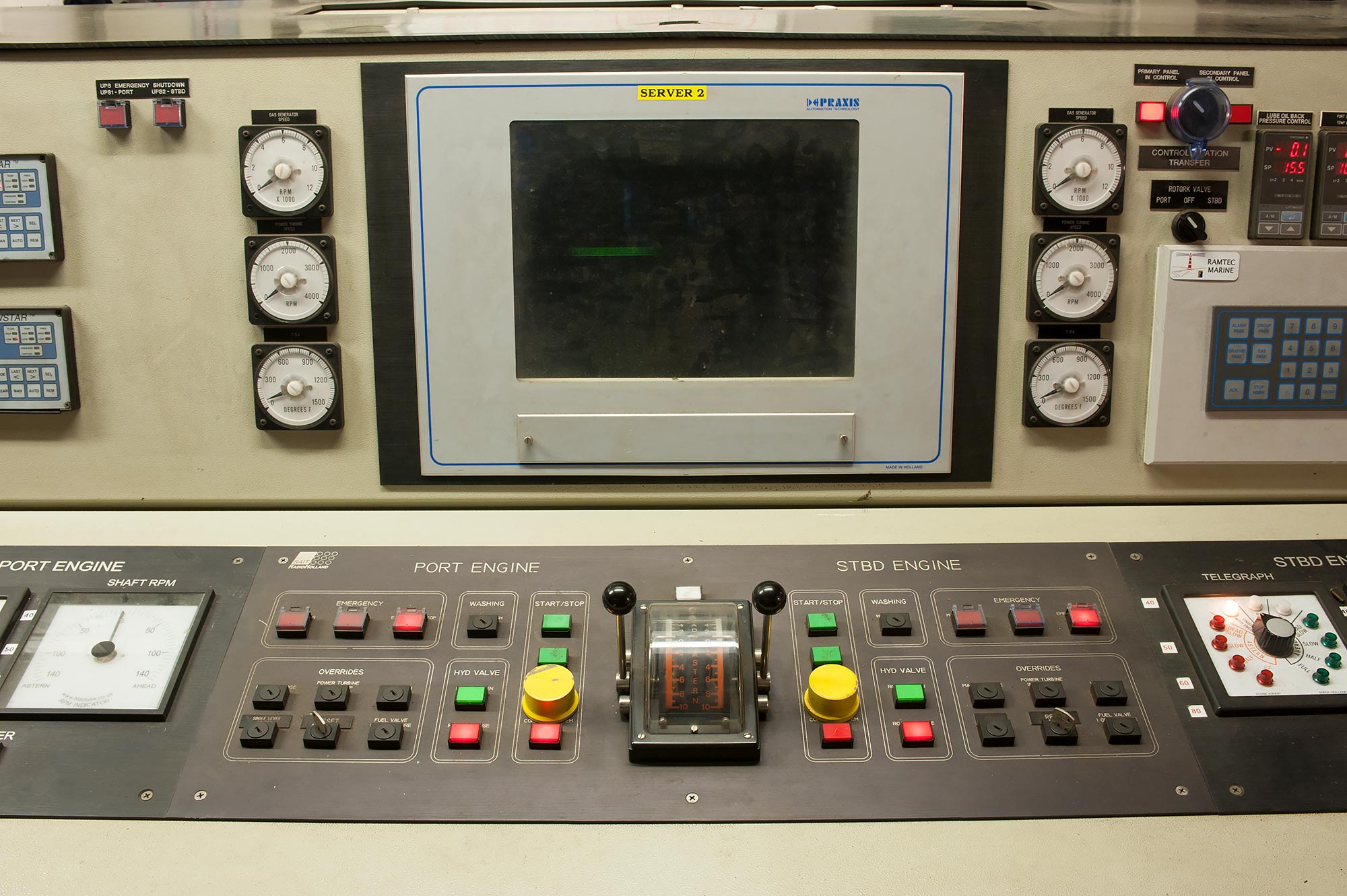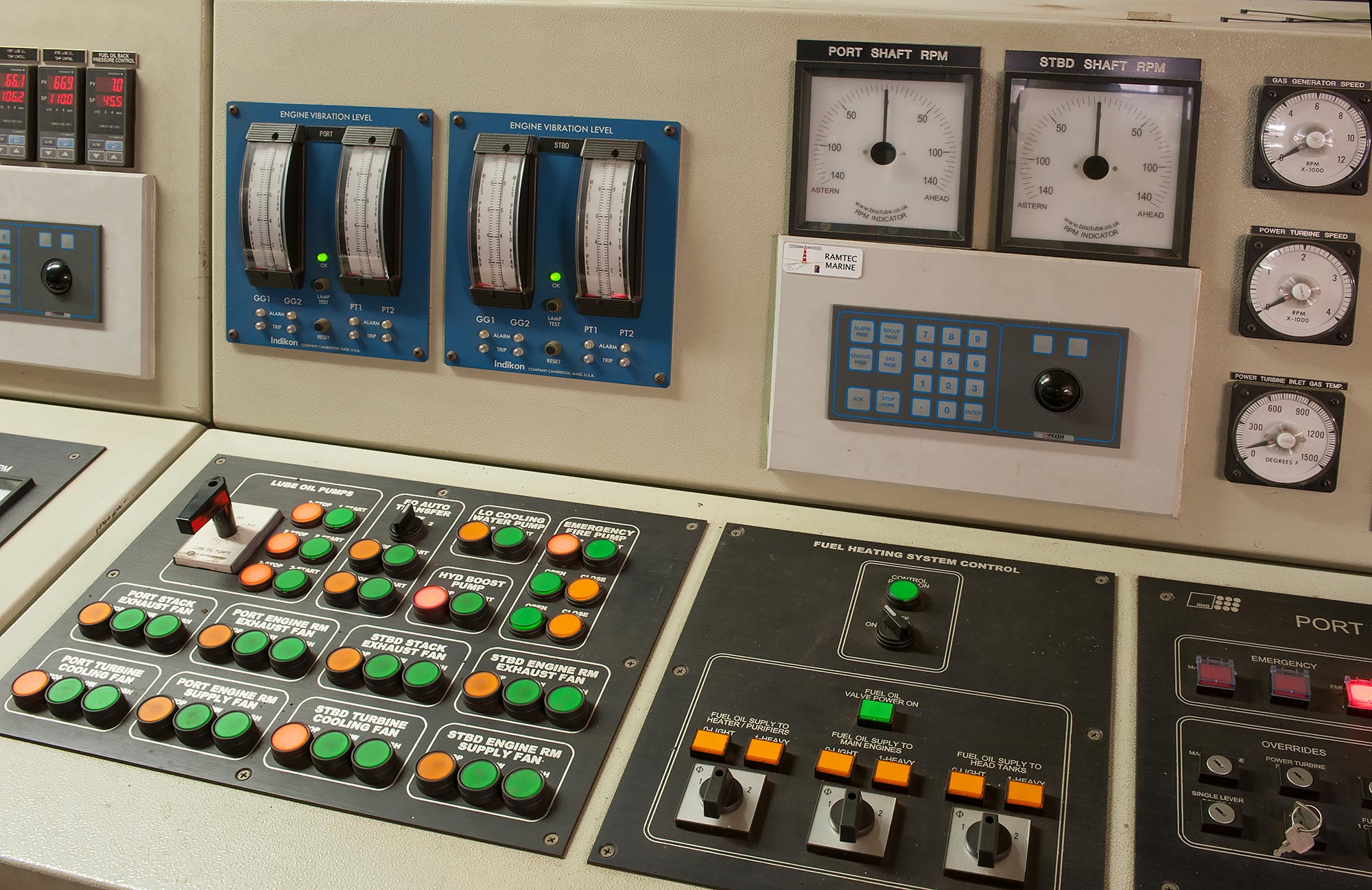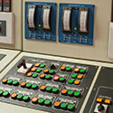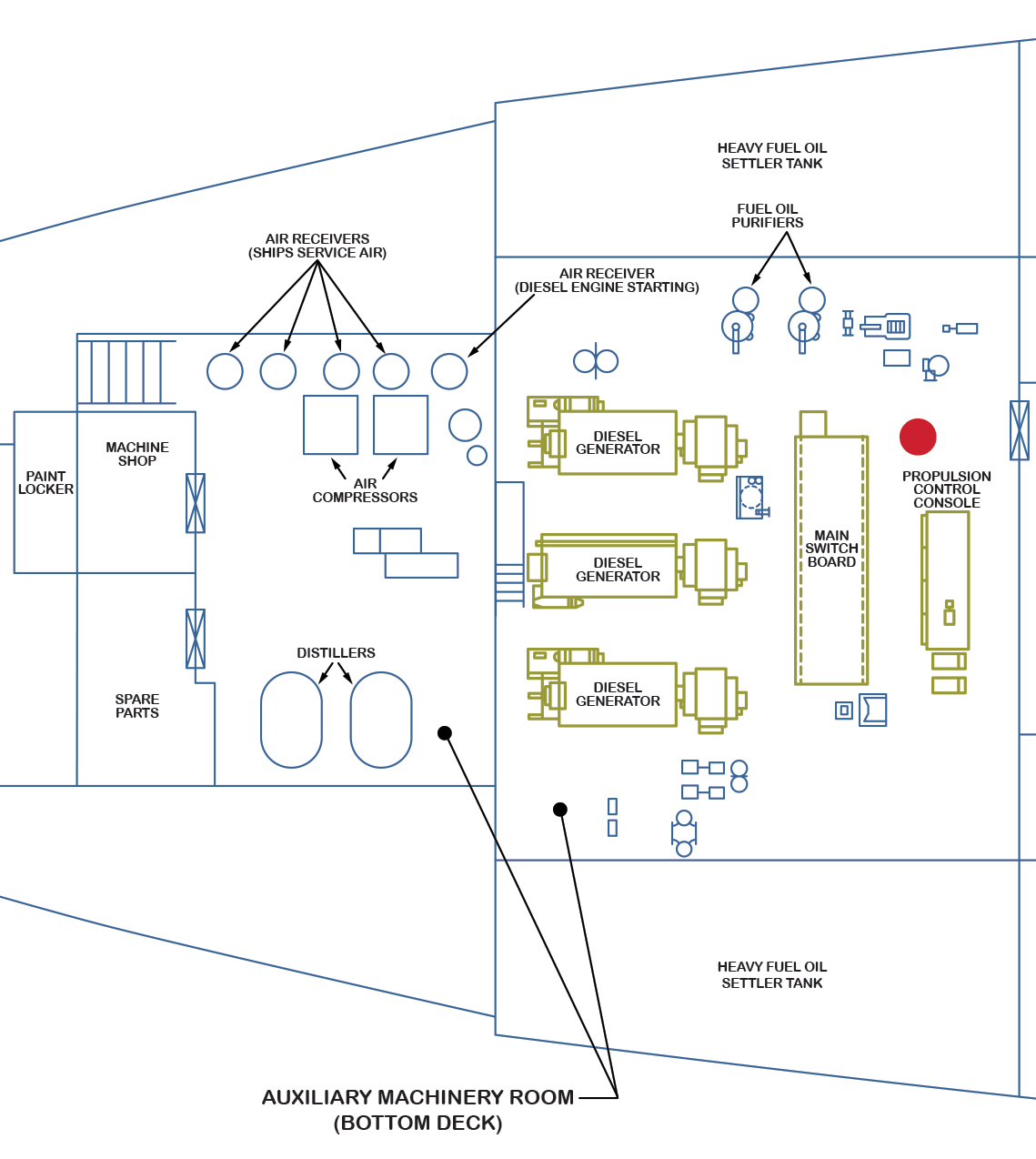 Control area, forward end of the auxiliary machinery space (port side). Panning left is the doorway that leads to the aft end of the engine room.