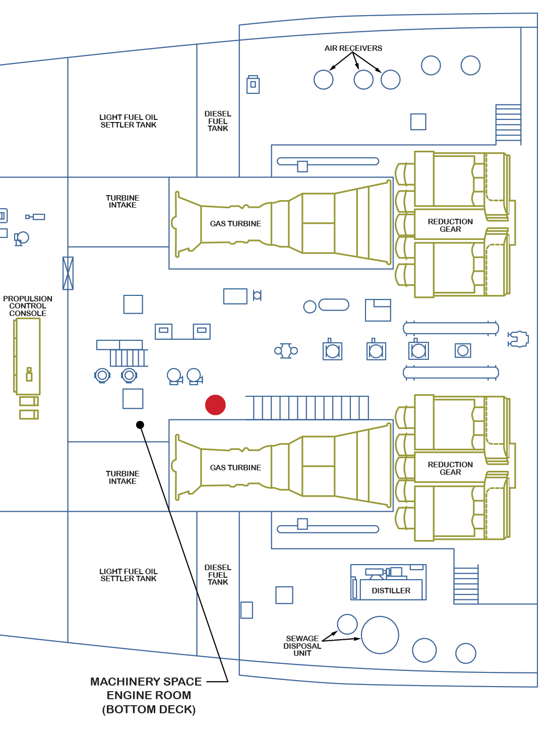 Aft end of engine room, (upper flat) starboard side. Initial view (looking port) the entry to the port engine compartment can be seen. Panning to the right is the entryway to the starboard engine compartment.