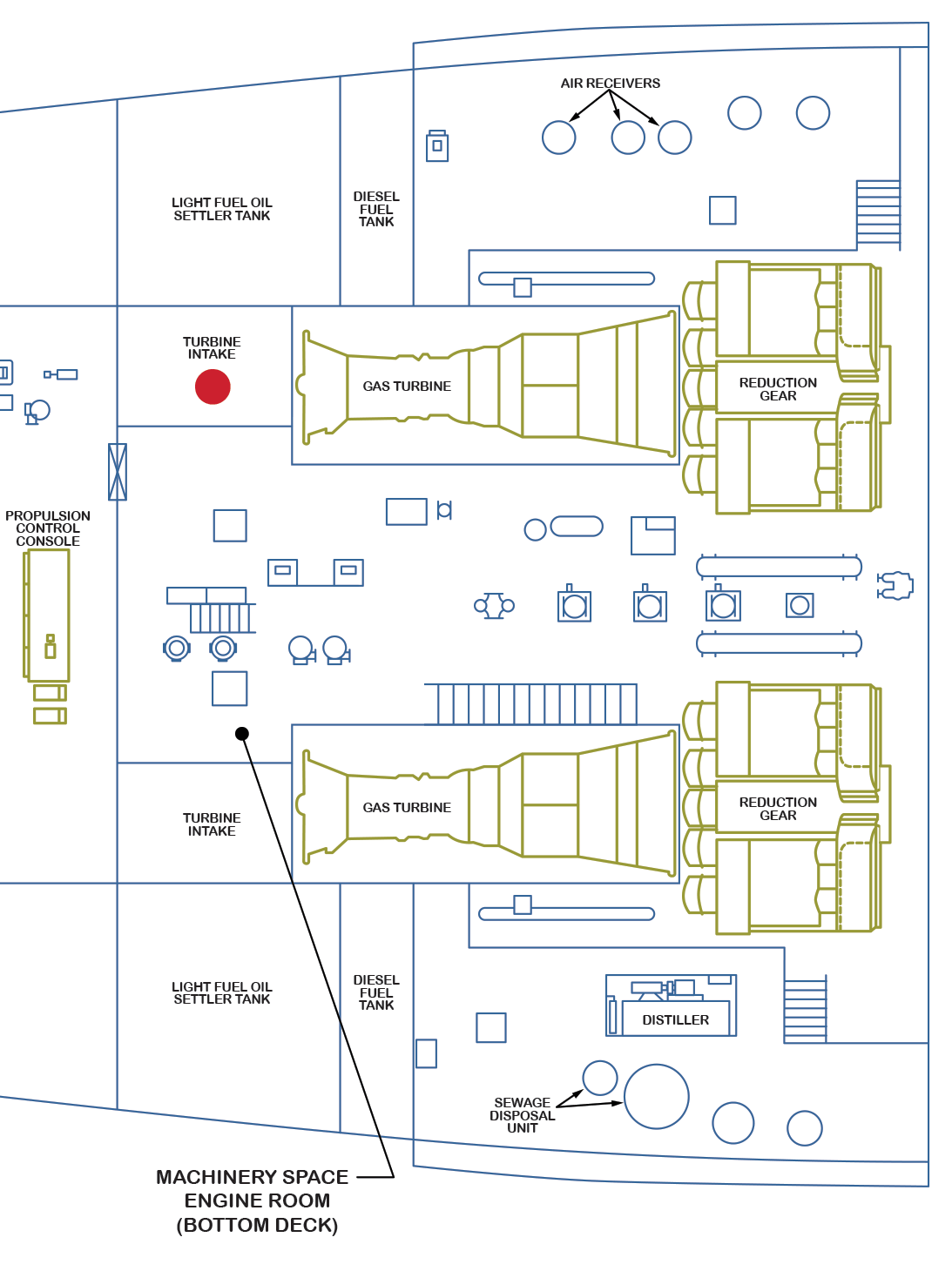 Interior view of the port engine intake compartment. This space is adjacent to the aft end of the engine compartment. Initial view is looking forward into the engine intake. The screened wall prevents debris from being ingested into the turbine blades.