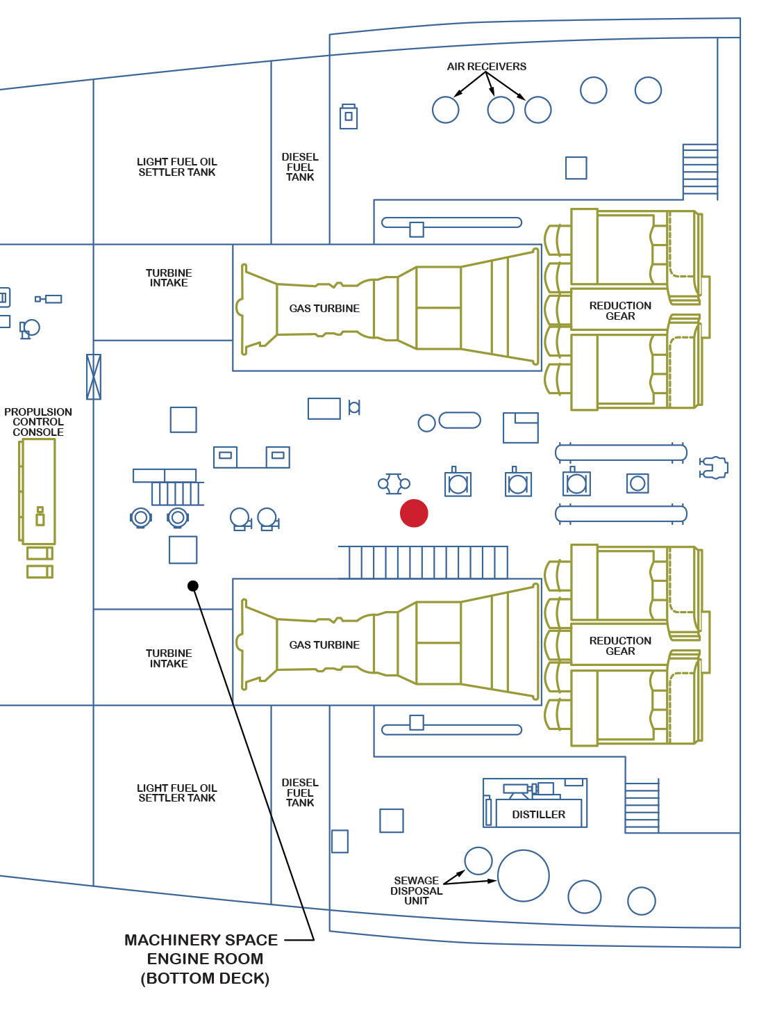 Lower flat of engine room. Initial view looking aft.
