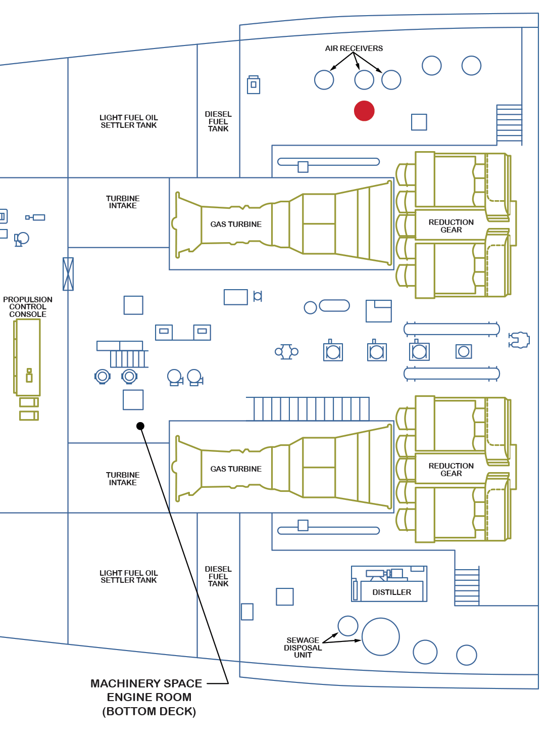 Forward end of upper flat of engine room (port side). Initial view looking at port reduction gear. Panning to the right directly behind the reduction gear is the port engine compartment.