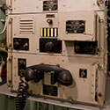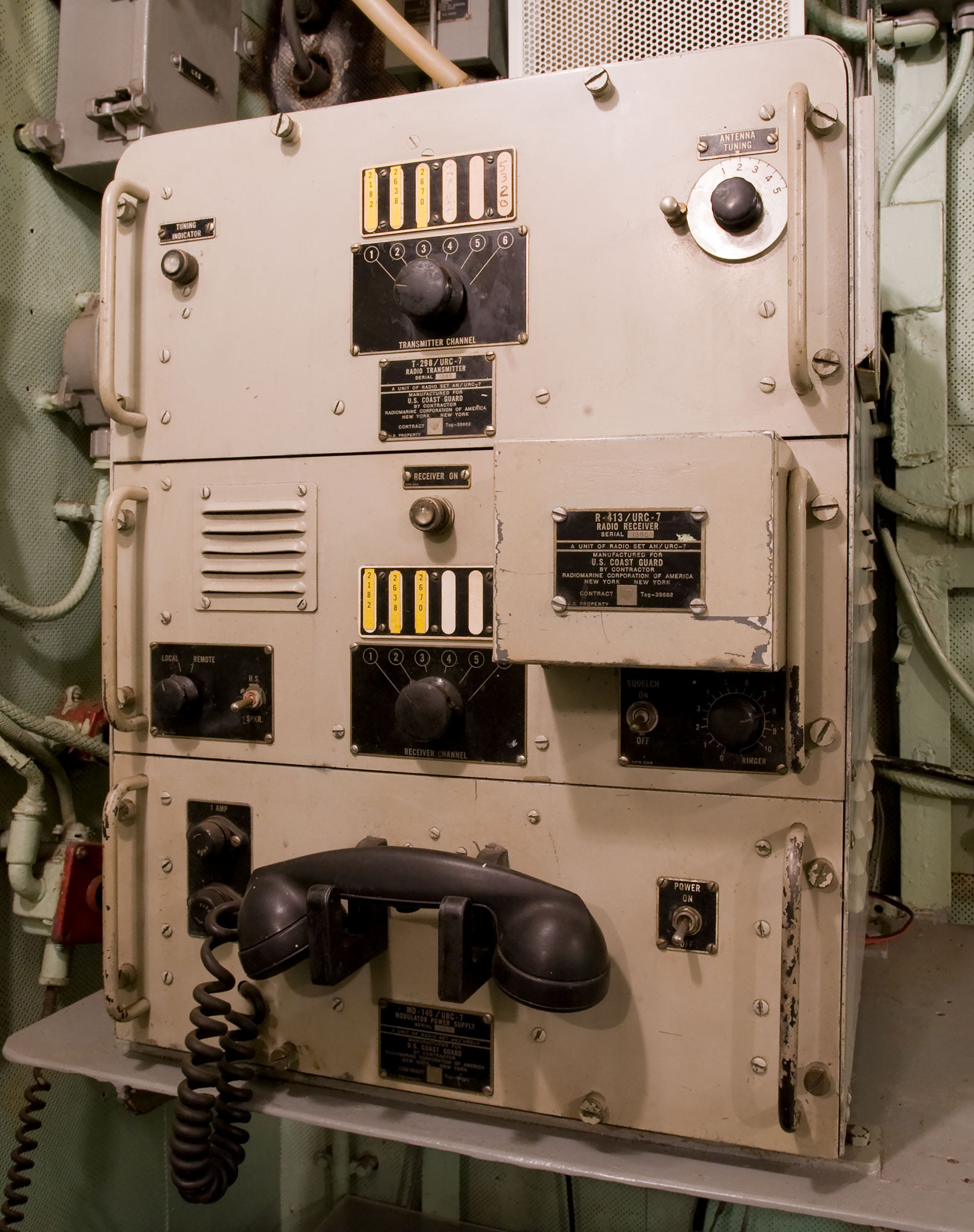 On this ship, we have been told by former crewmen that the engineer stood his watch in the Radio room and monitored the equipment in the engine room by taking hourly readings. The room contains a URC-7 SSB/AM ship to shore radio and work desk. The big black units are very low frequency radio beacon transmitters (320 kHz, below KFRC 610 kHz.) The gray central control panel synchronized their signals with the time tick WWV in Colorado so that the lightship’s signal would not interfere with other nearby radio beacon transmissions. Radio direction finders could take bearings, but some ships preferred to “home in” on the beacon. The gray panel on the bulkhead to the left of the entry door controls the main light. The file cabinet contains some of the original ship’s blueprints which are still used for reference today.