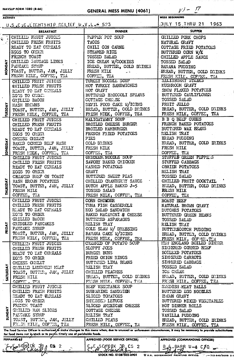 The all electric galley was used for cooking the three meals per day. There is a range, oven, deep fat fryer, dishwasher and refrigerator. On station, meals were prepared for 12, while in port the entire crew of 18 was aboard. The crew knew what would be served for the coming week. A seaman was usually assigned to assist the cook with clean-up duties. Although it could get rather hot in the galley, the portholes were operable to allow a cooling sea breeze, weather permitting. A Sample Menu can be seen at the entrance.