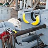 Weather Deck – Amidships. Initial view: Looking forward at the Conduit Clamping table (contained in the yellow fish plate). Above the clamping table can be seen cradles for the OUB Boats. Panning right: Pedestal for 59 ton crane. One corner of the SLAM Barge can be seen when looking directly aft.