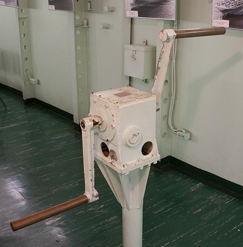 The Chief Petty Officer (CPO) mess is where the Hornet's CPO's (senior enlisted men) ate their meals. Adjacent to this space is the CPO lounge where the rudder centering device is located. This device was used to center the rudder and lock it into position if the steering mechanism was out of order.