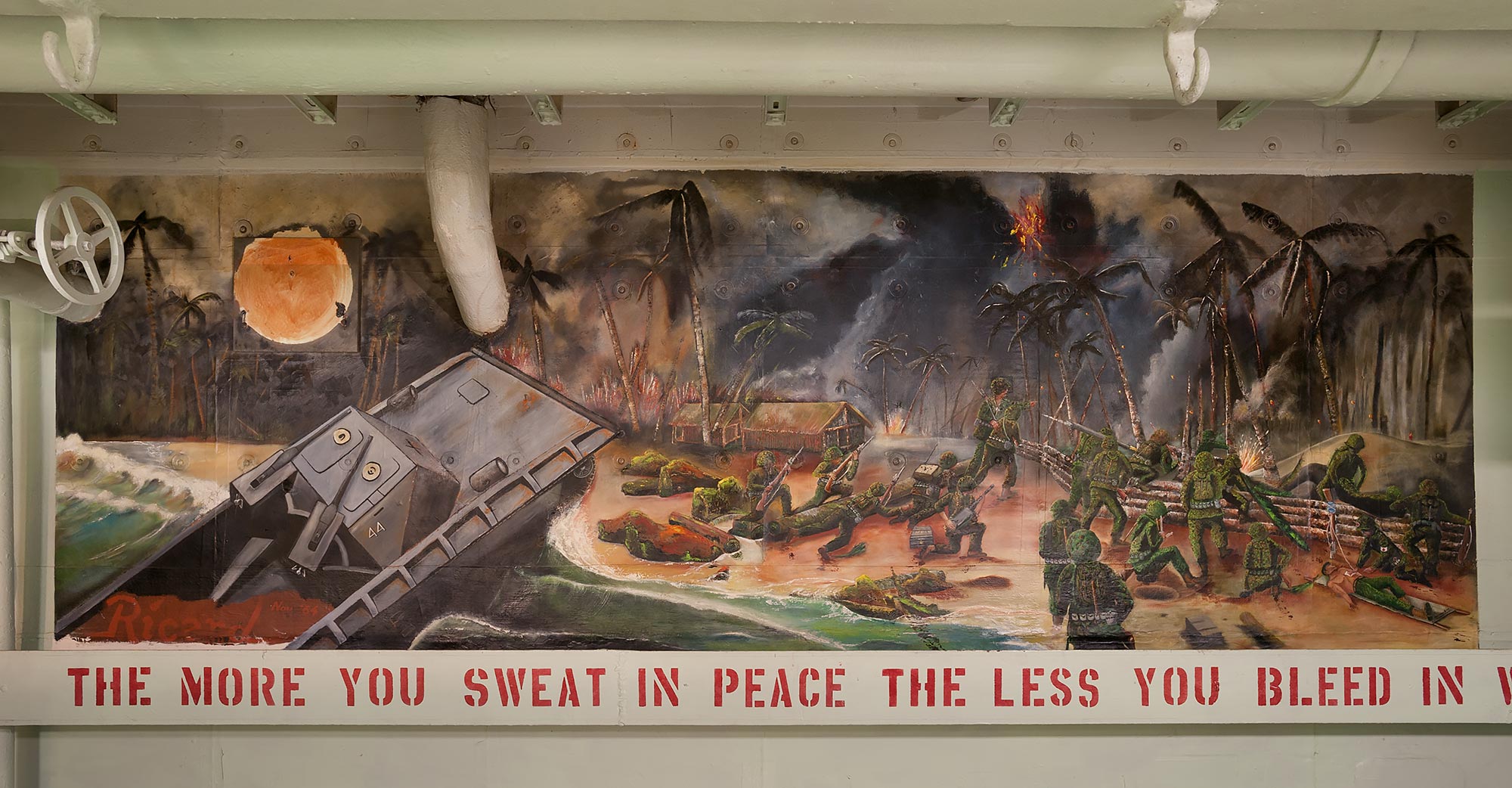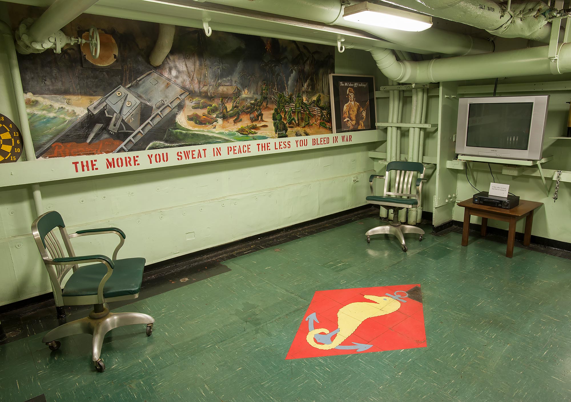 The Hornet had an extraordinary combat record in WW II, engaging the enemy in the Pacific in March 1944, just 21 months after the laying of her keel and the shortest shakedown cruise in Navy history (2 weeks). For eighteen months, she never touched land. She was constantly in the most forward areas of the Pacific war - sometimes within 40 miles of the Japanese home islands. Her pilots destroyed 1,410 enemy aircraft and over one million tons of enemy shipping. Her planes stopped the Japanese super-battleship Yamato and played the major part in sinking her. She launched the first strikes in the liberation of the Philippines, and in Feb. 1945, the first strikes on Japan since the Doolittle raid in 1942. The "Grey Ghost" participated in virtually all of the assault landings in the Pacific from March 1944 until the end of WW II, earning 9 battle stars and the Presidential Unit citation.