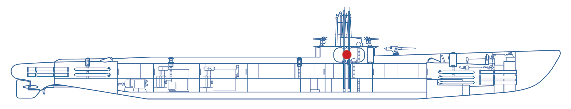 Located above the control room, the conning tower was primarily the attack and navigation center of the boat and the Commanding Officer's battle station. The conning tower is the smallest compartment on the submarine, only 8 feet in diameter and 17 feet long. Tracking a target and maneuvering into attack position could take several hours. During this time there could be as many as ten men at their battle stations.