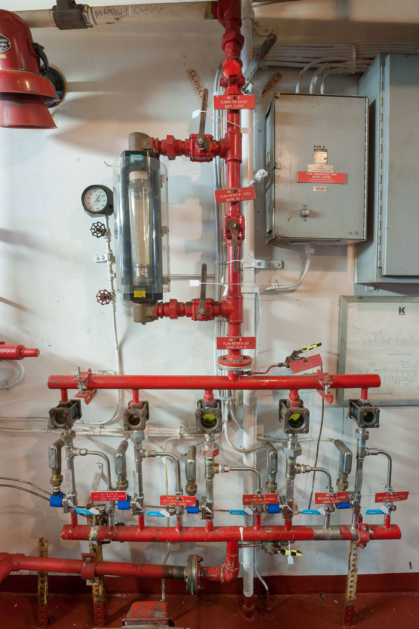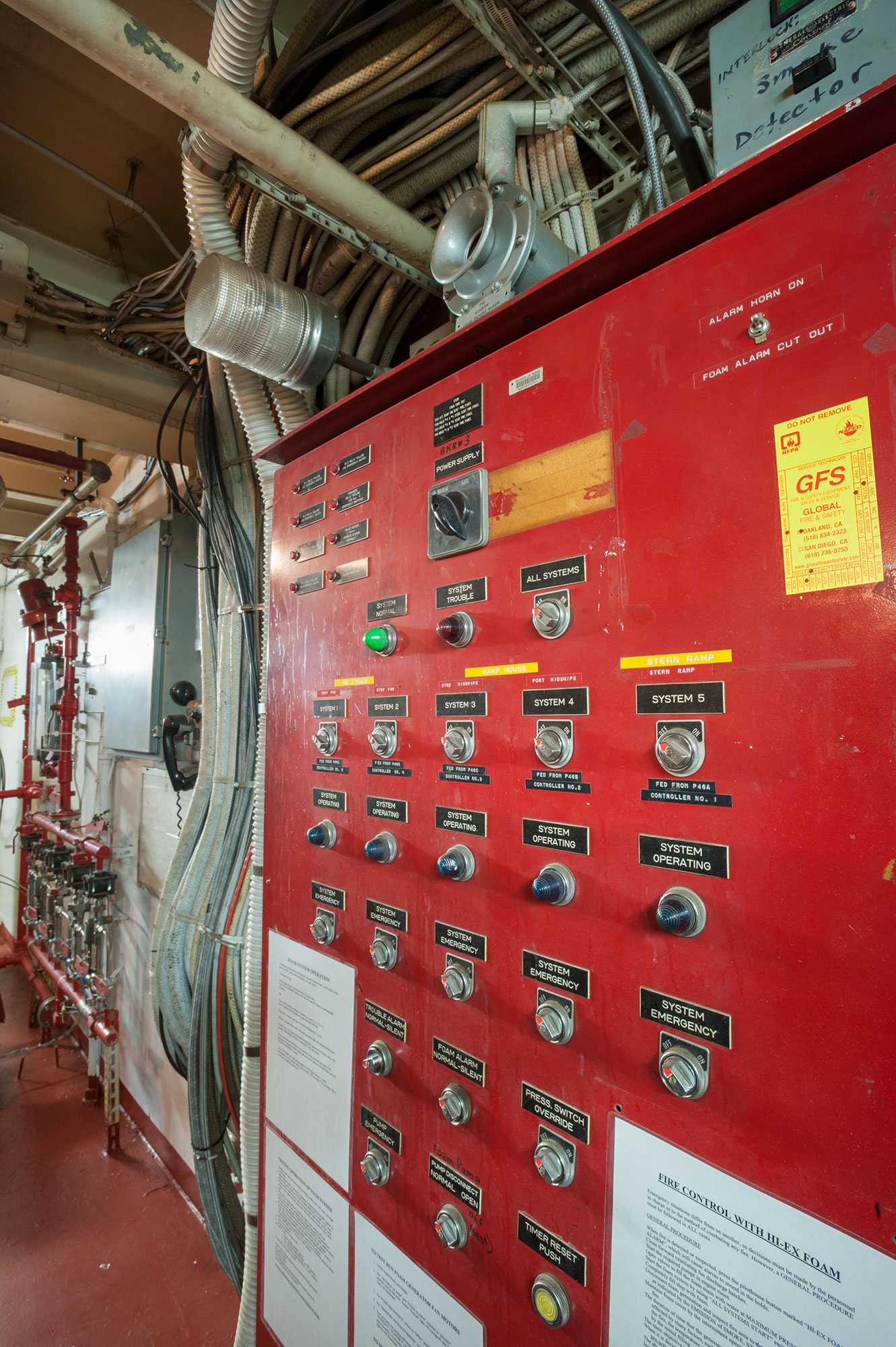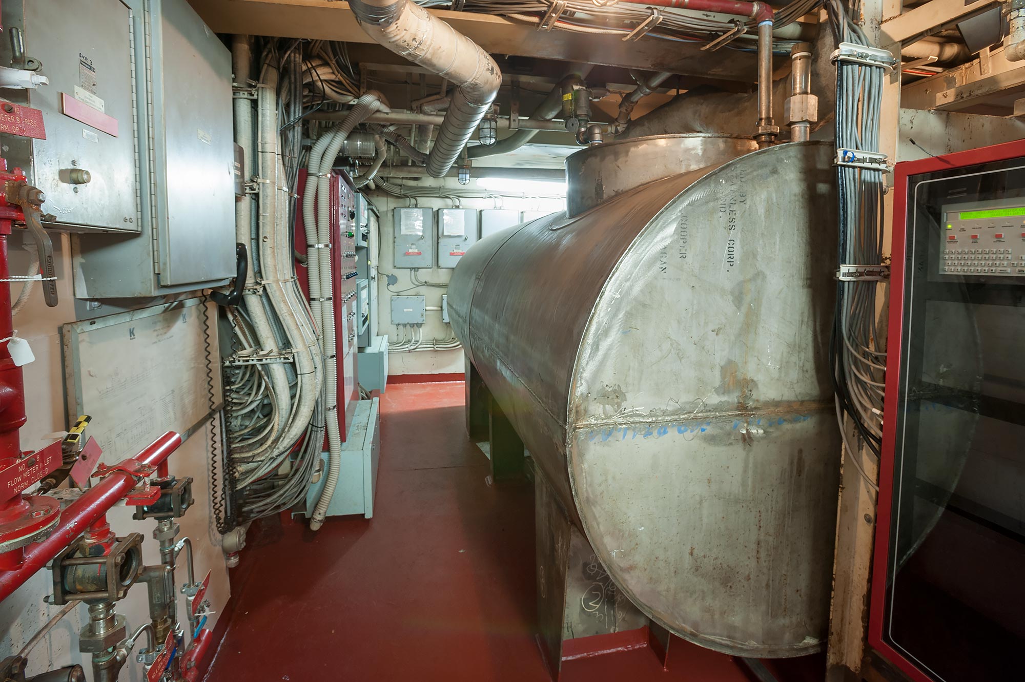 The CO2 room contains the gas cylinders for theCO2 flooding system used as the fixed fire fighting system on the Callaghan. It releases carbon dioxide to a protected space (such as engine room, cargo hold, pump room, etc.) under fire. When applied to a fire, CO2 provides a heavy blanket of gas that reduces the oxygen level to a point where combustion cannot occur.