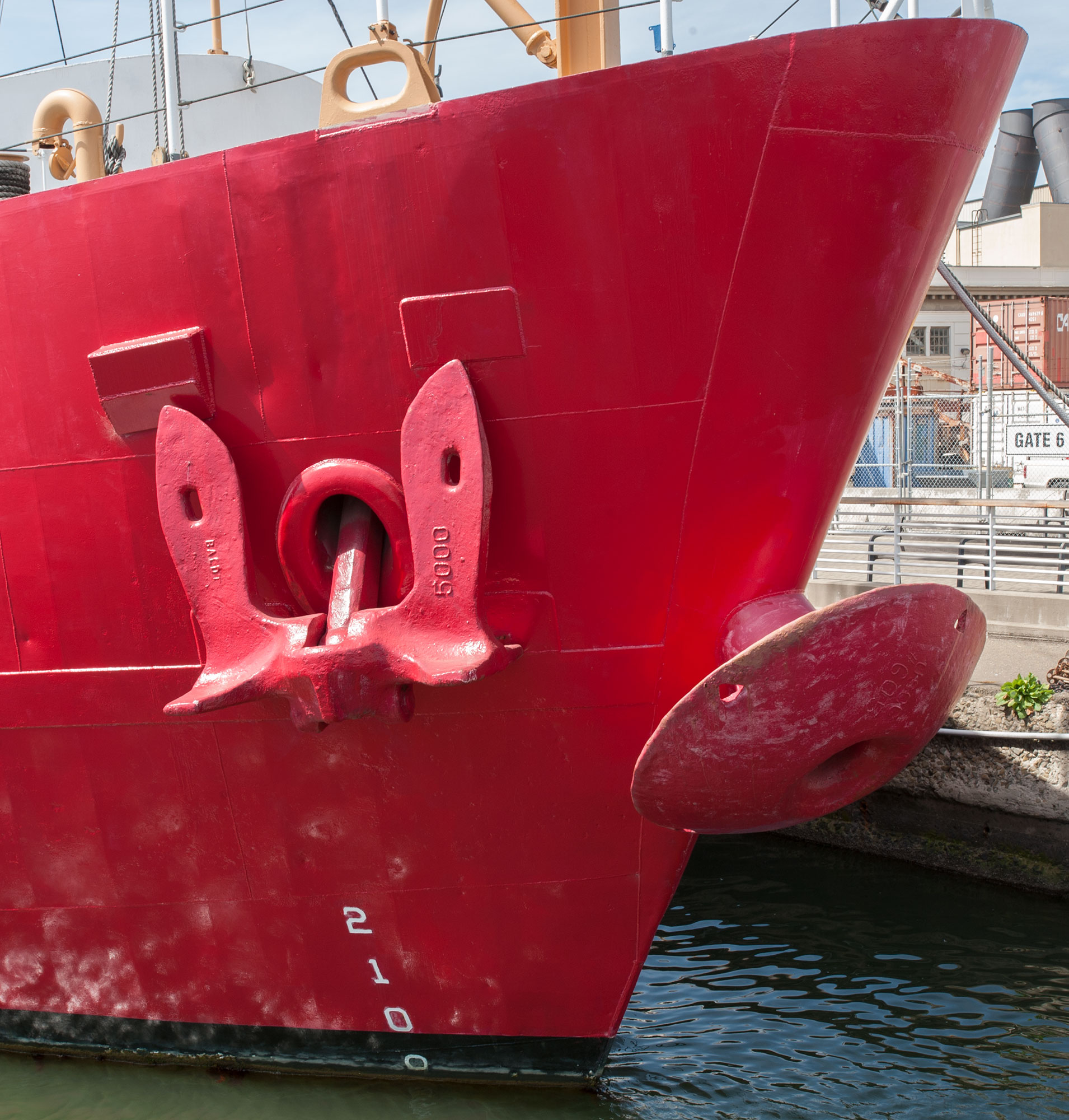 Due to its superior holding power, the "mushroom" became the standard anchor for use aboard lightships in this country. Varying in size from 3,000 to 8,000 pounds, the anchor would normally be stowed in the hawse pipe extending from the bow on the centerline of the ship. Frequently the spare anchors were also mushroom anchors, although the newer lightship often carried standard 5,000 pound "Navy" anchors. When deployed, the anchor would be attached to the end of a length of chain that would normally be let out to 7 to 8 times the depth of the water. When "stowed", the anchor would fit snuggly into the hawse pipe.