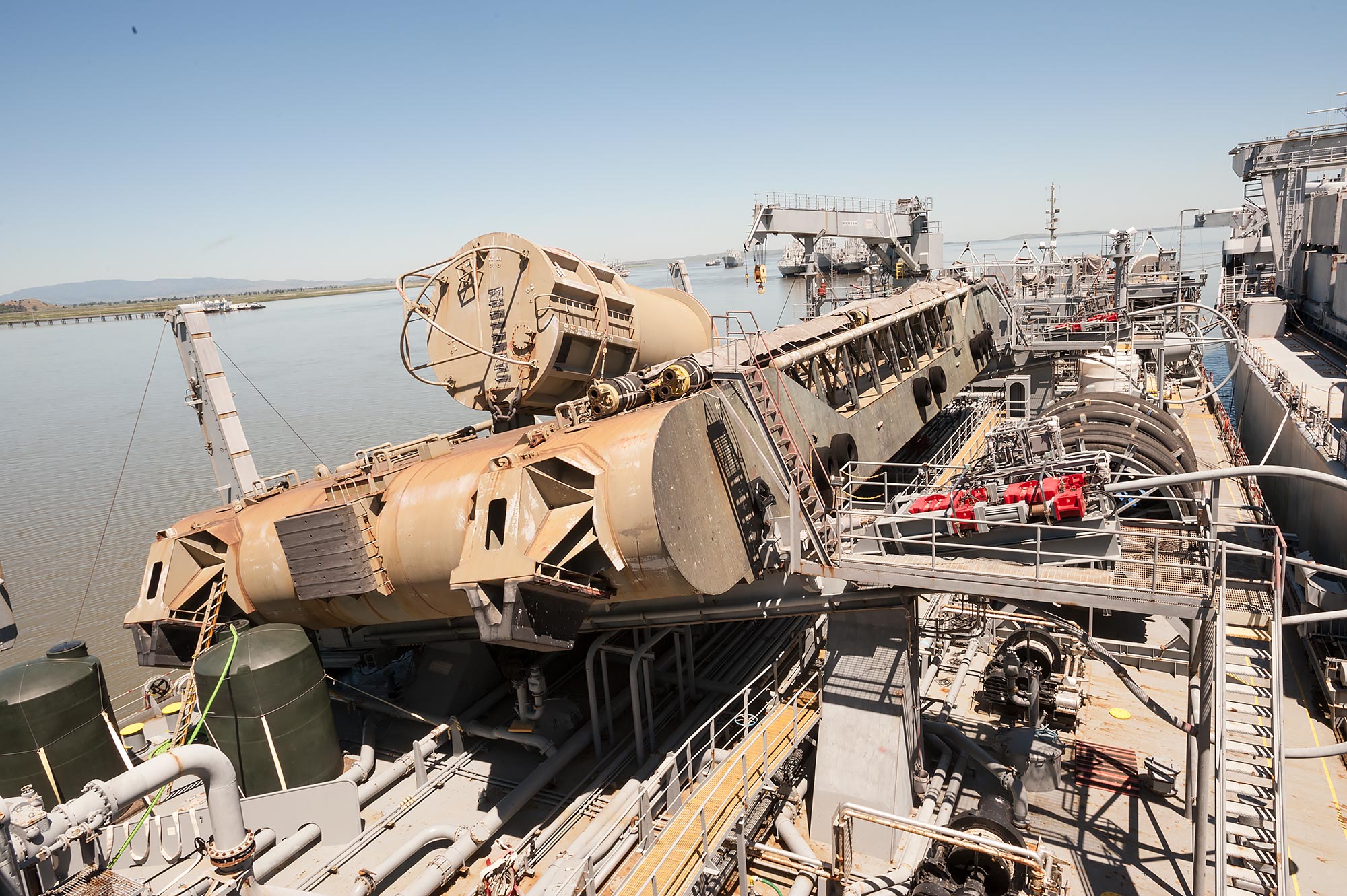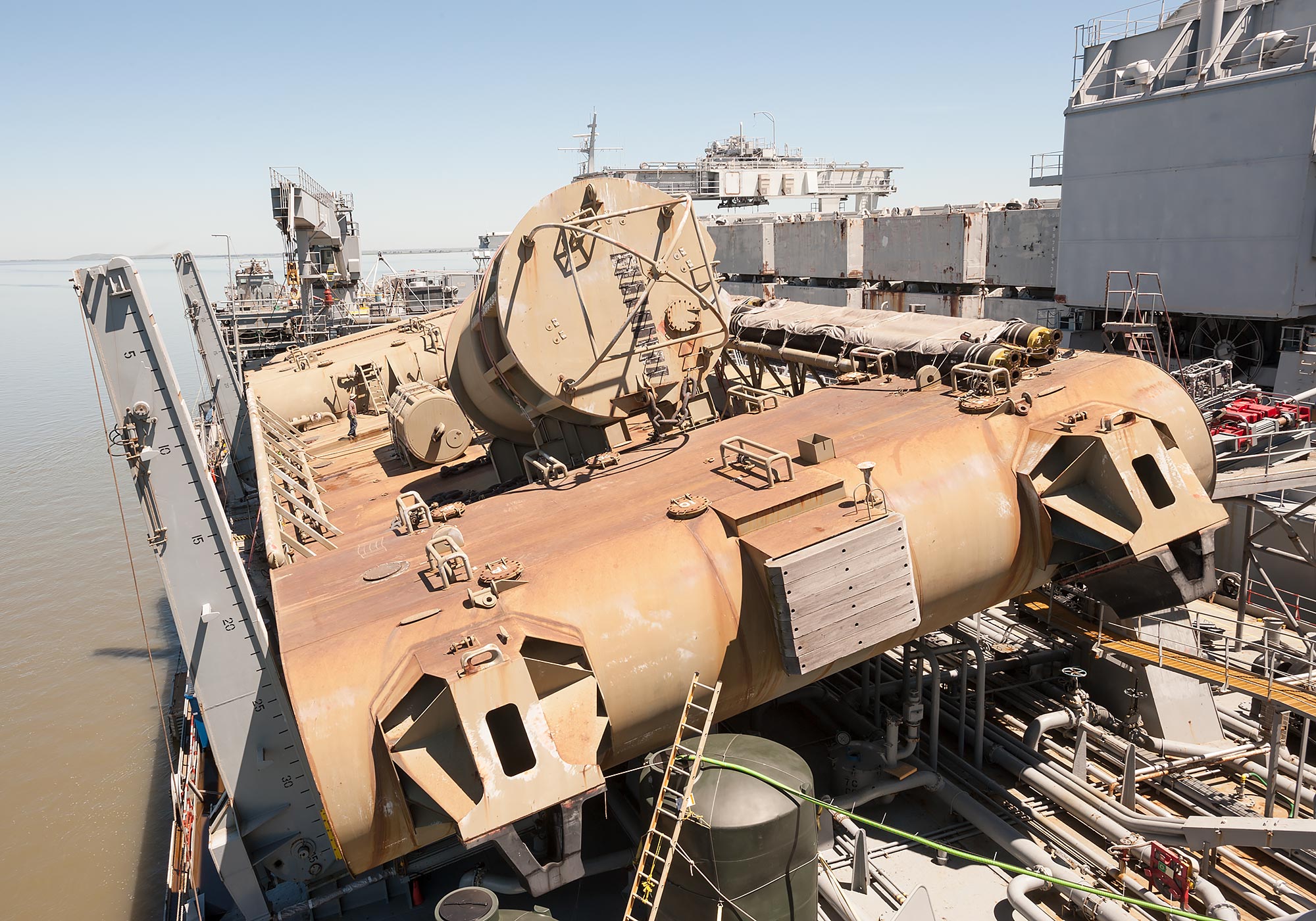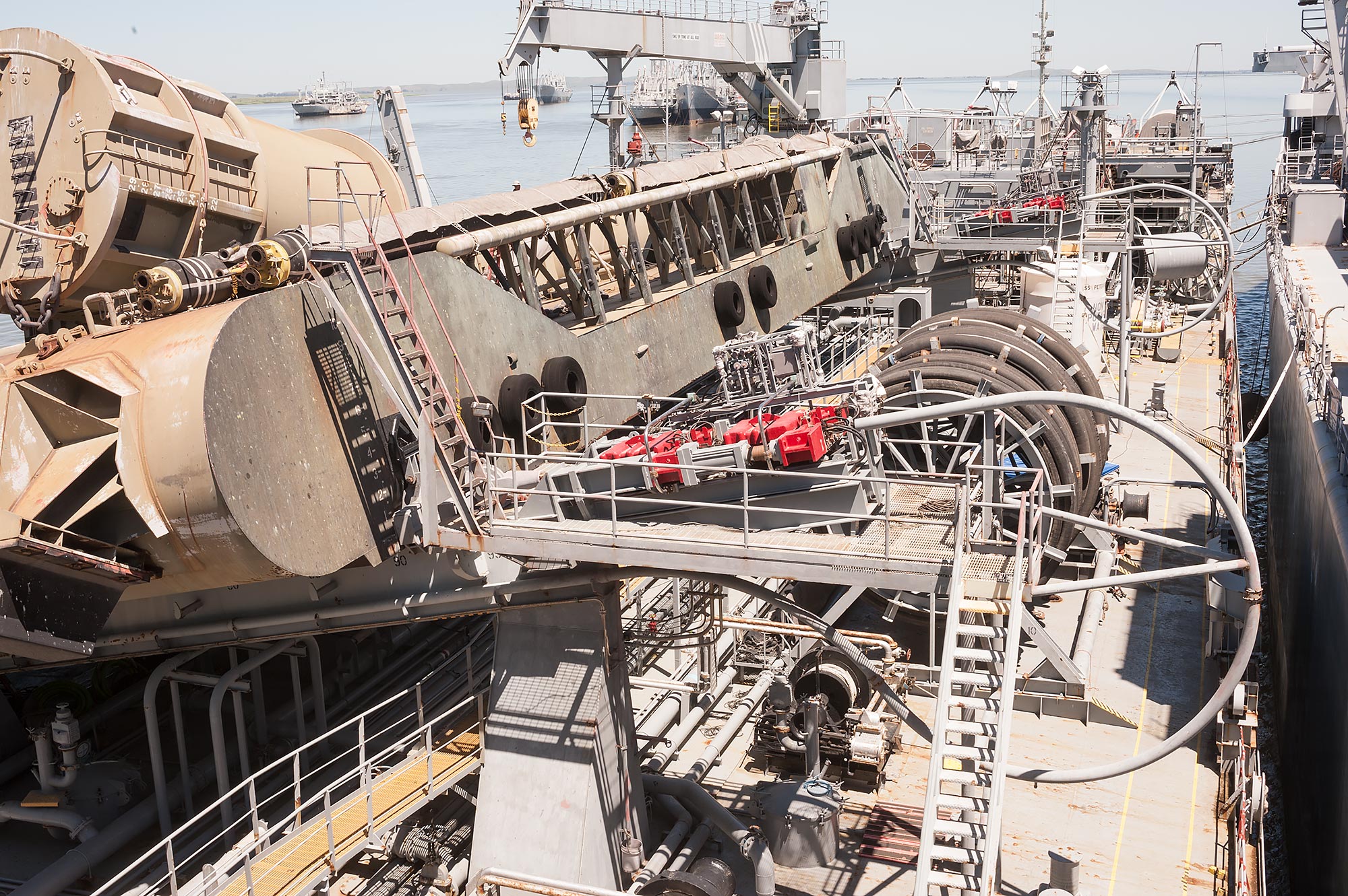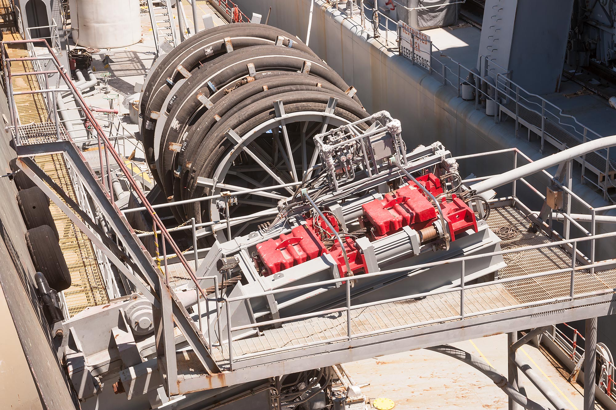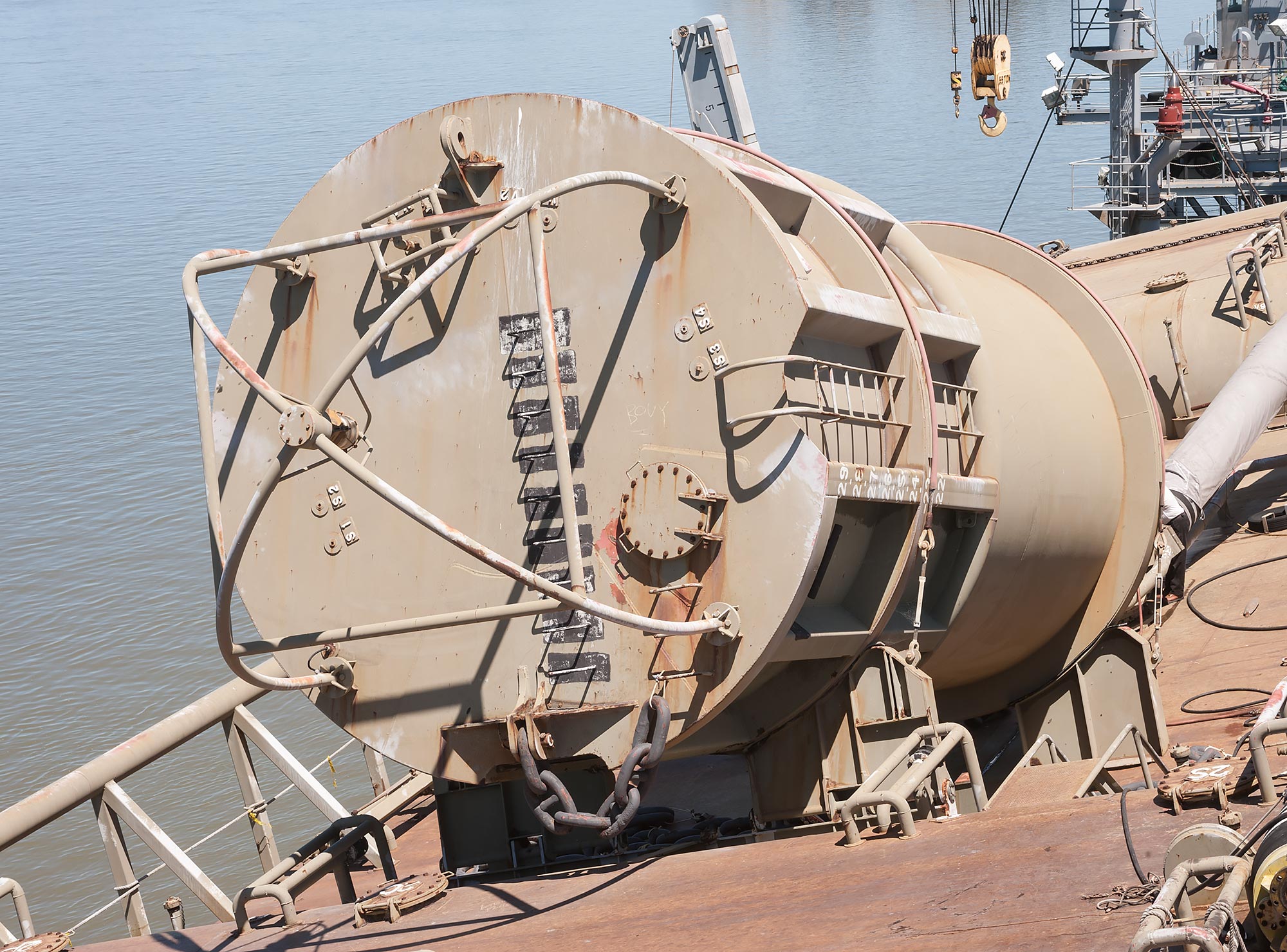 SALM (Single Anchor Leg Mooring) – Main Deck. Initial view: (on the left) submarine hoses and (on the right) the deep water mooring buoy.