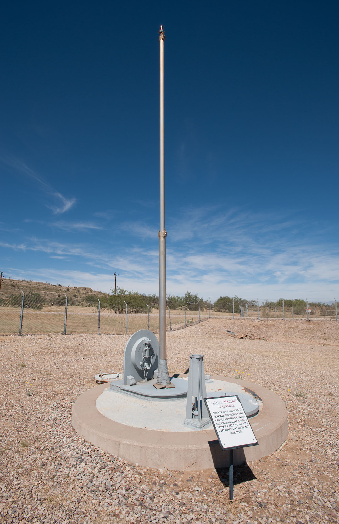 This is not part of the launch silo, but a separate silo-like structure located some distance away from the silo. This structure contains a hardened high frequency radio antenna. The antenna is normal kept safely underground to shield it from the effects of a nuclear detonation. When needed, the antenna telescopes out from its underground silo and can be raised as high as 117 feet (35 m).
